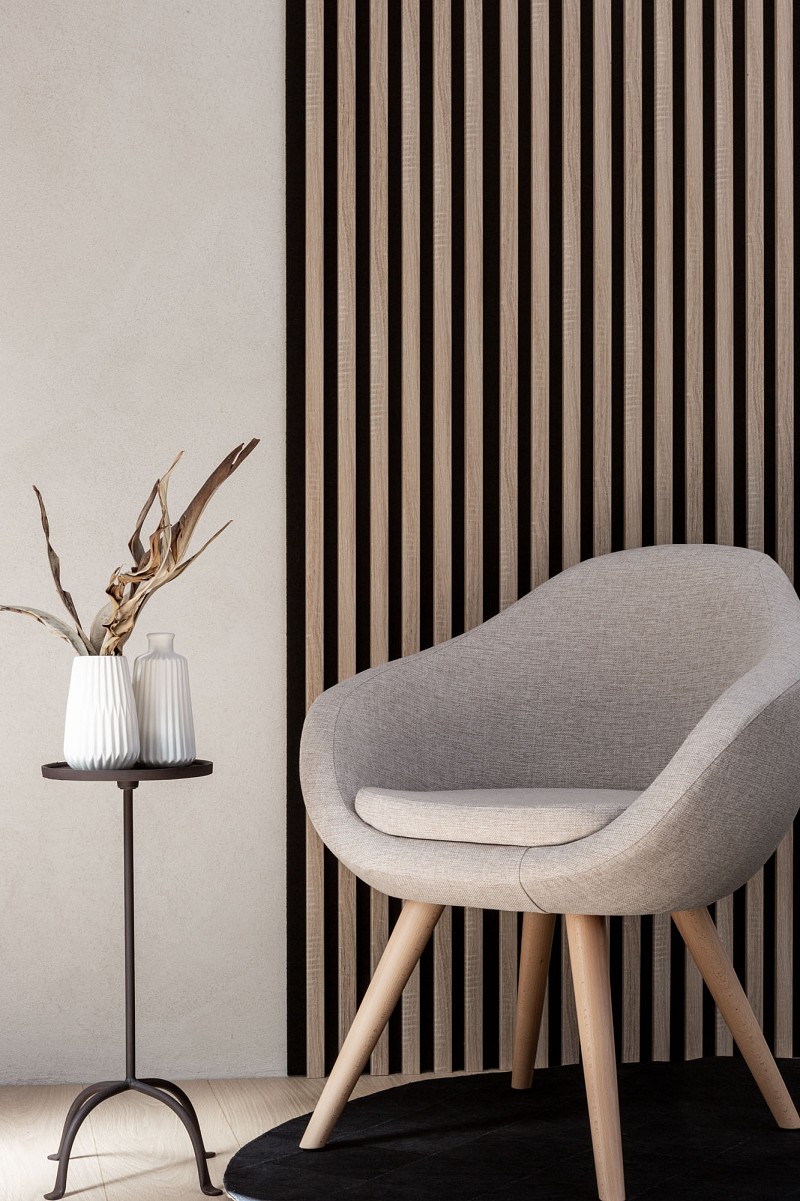 Woodline - рейкові панелі на повстяній основі для оформлення приватного та громадського простору. Панелі виконують роль оригінального декору і дозволяють візуально розділити простір, виділивши місце відпочинку, денну зону, домашній офіс або їдальню. Завдяки повстяній основі та просторовій конструкції панелі також допомагають покращити звукоізоляцію приміщення, прибрати відлуння та гул.