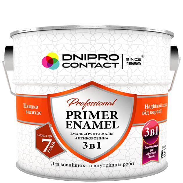 Грунт-емаль 3в1 «Дніпро-Контакт» призначена для декоративно-захисного фарбування металевих, дерев'яних та інших поверхонь всередині і зовні приміщень. Грунт-емаль 3в1 — це універсальний продукт, що дозволяє одночасно запобігти корозії, позбутися іржі і отримати довговічне атмосферостійке покриття.
