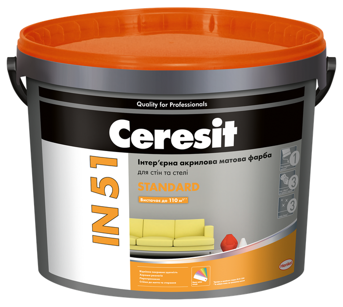 Акрилова фарба Ceresit IN 51 призначена для фарбування поверхонь будівельних конструкцій та елементів усередині будівель по мінеральних (бетон, цегла, цементно-піщані штукатурки, гіпсові штукатурки і плити тощо) і органічних основах (шпалери, склохолст, полістирольні плити, фанера, деревостружкові та деревоволокнисті плити) в приміщеннях з нормальним експлуатаційним навантаженням. Допускається миття з використанням побутових миючих засобів. Можливе багатократне ремонтне перефарбування без видалення попереднього шару. Не застосовувати для фарбування підлоги. Дозволена до використання в будівлях медичного призначення та дитячих закладах.