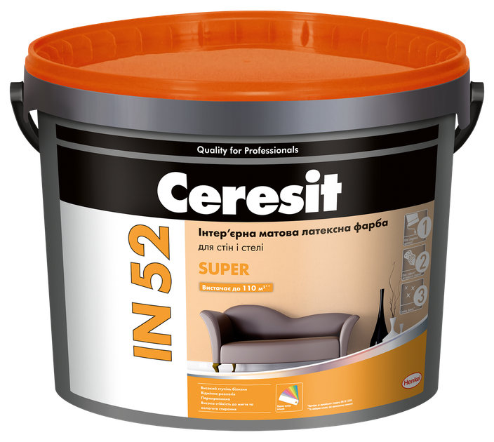 Акрилова фарба Ceresit IN 52 призначена для фарбування поверхонь будівельних конструкцій та елементів усередині будівель по мінеральних (бетон, цегла, цементно-піщані штукатурки, гіпсові штукатурки і плити тощо) і органічних основах (шпалери, склохолст, полістирольні плити, фанера, деревостружкові та деревоволокнисті плити) в приміщеннях з нормальним експлуатаційним навантаженням. Допускається миття з використанням побутових миючих засобів. Можливе багатократне ремонтне перефарбування без видалення попереднього шару. Не застосовувати для фарбування підлоги. Дозволена до використання в будівлях медичного призначення та дитячих закладах.