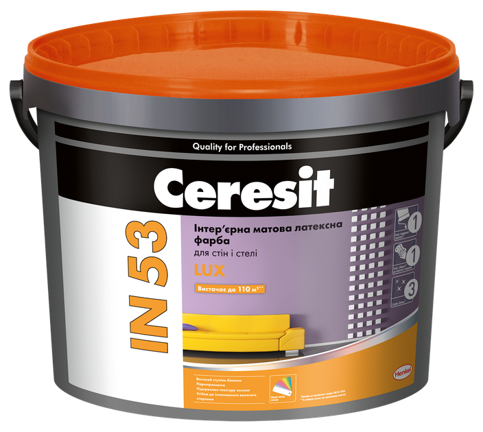 Інтер’єрна матова латексна фарба Ceresit IN 53 призначена для фарбування поверхонь будівельних конструкцій та елементів усередині будівель по мінеральних (бетон, цегла, цементно-піщані штукатурки, гіпсові штукатурки та плити тощо) і органічних основах (шпалери, склохолст, полістирольні плити, фанера, деревостружкові та деревоволокнисті плити), що несуть високе експлуатаційне навантаження та потребують частого миття з використанням побутових миючих і дезінфікуючих засобів. Може використовуватися у приміщеннях з підвищеною вологістю. Не застосовувати для фарбування підлоги. Дозволена до використання в будівлях медичного призначення та дитячих закладах.