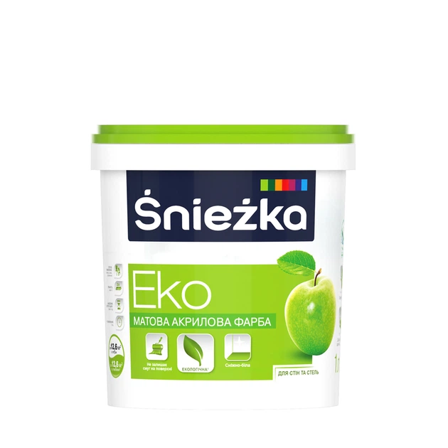 Фарба водоемульсійна Sniezka Еко виготовляється за міжнародними стандартами, що гарантує її екологічність та якісні характеристики. Висока покривна здатність робить нанесення на стіни та стелю рівномірним, не перешкоджаючи при цьому “дихаючим” властивостям поверхні, яка обробляється. Сніжно-біла акрилова фарба призначена для фарбування основ з цементних, цементно-вапняних, вапняних, гіпсових, гіпсокартонних плит, дерев’яних та деревопохідних матеріалів всередині приміщень.