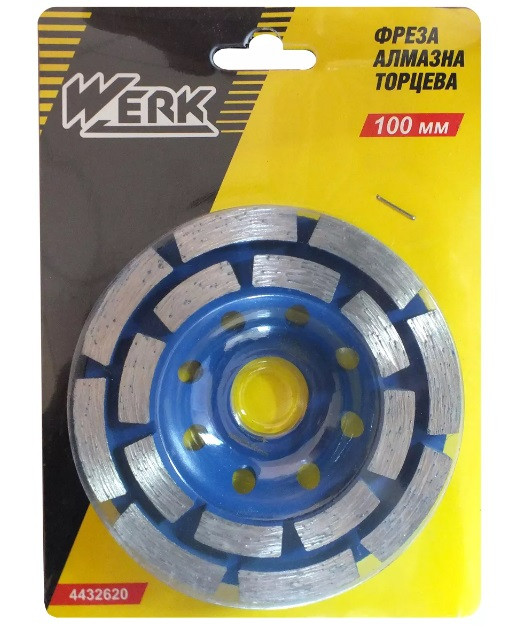 Фреза алмазна торцева Werk 100х22.23 Фреза алмазна торцева Werk - дворядна, застосовується для чистових будівельних робіт. Призначена для робіт з шліфування, вирівнювання та зачистки бетону, цегли, каменю, мармуру, граніту тощо. Робоча кромка Turbo забезпечує якісну обробку поверхні. Делікатна обробка досягається завдяки використанню спеціальної фракції, що дозволяє зробити матеріал максимально рівним.