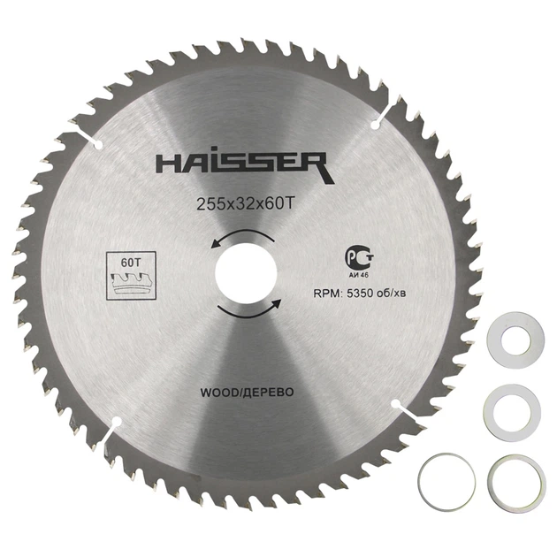 Виробник: Haisser. Країна походження: Китай. Матеріал: Дерево. Діаметр диска: 255 мм. Тип диска: Відрізний. Посадка: 32 мм. Кількість зубів: 60. Товщина диска: 2 мм.