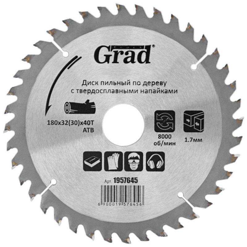 Диск пиляльний по дереву з твердосплавними напайками Ø180×32 (30)×40Т, 8000об/хв GRAD (1957645) призначений для виконання будь-яких стандартних робіт по дереву, різання виробів з м'якої і твердої деревини, фанери, ДСП, ДВП, МДФ і комбінованих матеріалів на основі дерева. Додатковою перевагою є можливість заміни і заточування зуба. Характеристики: Розміри узгоджені з посадочними і зовнішніми діаметрами всіх найбільш поширених типів електроінструменту; Забезпечують поздовжній і поперечний розпив; Сучасна автоматизована технологія виготовлення; Змінні зуби з твердого сплаву форми АТВ; Оптимальна продуктивність завдяки міцно припаяним твердосплавним зубах; Можливість багаторазової переточки інструменту; Застосовують для побутового та професійного використання; Забезпечують стабільну роботу при економічною ціною. Основні дані Торгова марка Grad Комплектація Полістирольний захист зубів, перехідне кільце 30 мм Технічні дані Тип по дереву Максимальна товщина різу, мм 1.7 Діаметр диску, мм 180 Діаметр посадкового отвору, мм 32.0 Максимальна кількість обертів, об/хв 8000 Кількість зубів, шт 40 Товщина диска, мм 1.4