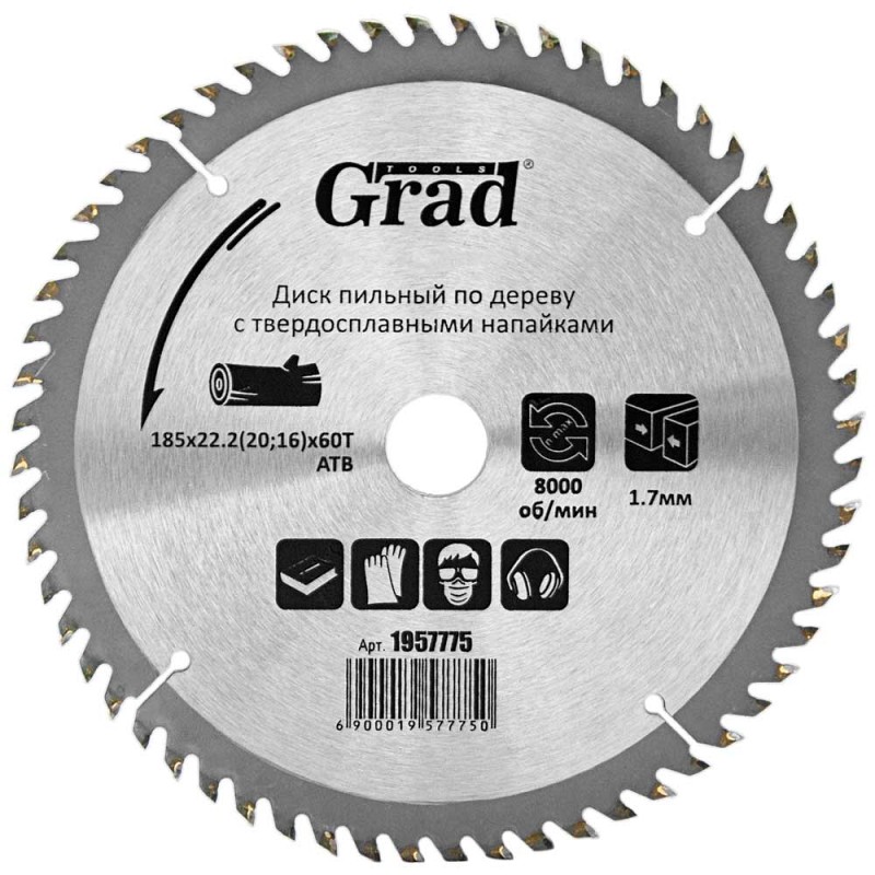 Диск пиляльний по дереву з твердосплавними напайками Ø185×22.2 (20; 16)×60Т, 8000об/хв GRAD (1957775) призначений для виконання будь-яких стандартних робіт по дереву, різання виробів з м'якої і твердої деревини, фанери, ДСП, ДВП, МДФ і комбінованих матеріалів на основі дерева. Додатковою перевагою є можливість заміни і заточування зуба. Характеристики: Розміри узгоджені з посадочними і зовнішніми діаметрами всіх найбільш поширених типів електроінструменту Забезпечують поздовжній і поперечний розпив Сучасна автоматизована технологія виготовлення Змінні зуби з твердого сплаву форми АТВ Оптимальна продуктивність завдяки міцно припаяним твердосплавним зубах Можливість багаторазової переточки інструменту Застосовують для побутового та професійного використання Забезпечують стабільну роботу при економічною ціною Основні дані Торгова марка Grad Комплектація Полістирольний захист зубів, перехідне кільце 20 мм, 16 мм Технічні дані Тип по дереву Максимальна товщина різу, мм 1.7 Діаметр диску, мм 185 Діаметр посадкового отвору, мм 22.2 Максимальна кількість обертів, об/хв 8000 Кількість зубів, шт 60 Товщина диска, мм 1.4 Залишити відгук