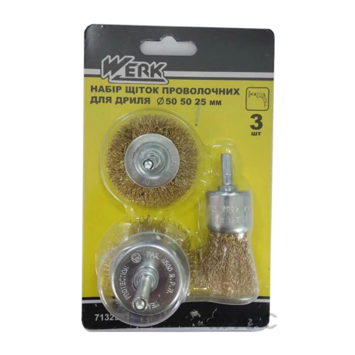 Набір щіток дротяних WERK WE107700/7132903 3 шт застосовується як додаткова насадка для дрилі і шуруповерта для зачищення поверхонь з металу, пластику і деревини. Ефективно справляється з брудом, іржею, корозією і лакофарбовими матеріалами. Завдяки зручній формі за допомогою щітки можна обробити внутрішні кути і стики металевих деталей і зварних швів. Для дротяної основи використовується тільки високоякісний матеріал з оптимальною щільністю і жорсткістю. Вона розрахована на багаторазове використання.