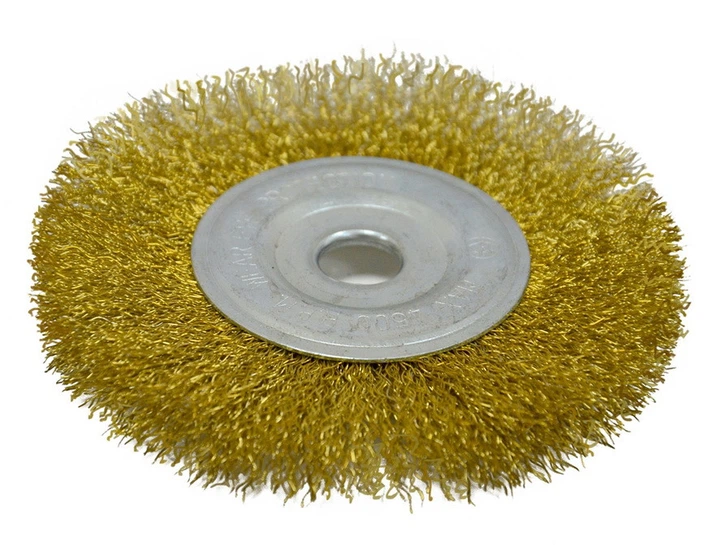 Щітка-крацовка дискова латунна рифлена. Призначена для використання разом з УШМ (болгаркою). Основне призначення щітки: зачистка металевих, дерев'яних, пластикових і інших поверхонь від всіляких забруднень (бруд, іржа, корозія, фарба, лак). Якісний метал, товщина дроту 0,3 мм. Має оптимальну щільність і надійність кріплення дроту в металевій обоймі.