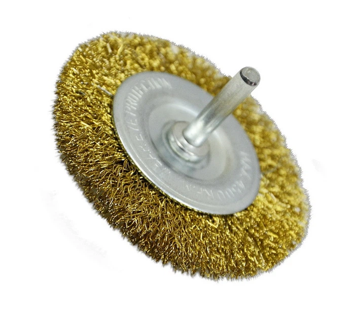 Щітка-крацовка зі шпилькою, дискова, латунна, рифлена. Призначена для використання разом з дрилем, шуруповертом. Основне призначення щітки: зачистка металевих, дерев'яних, пластикових і інших поверхонь від всіляких забруднень (бруд, іржа, корозія, фарба, лак). Добре підходить дана щітка для зачистки внутрішніх кутів і стиків металевих деталей або зварювальних швів. Якісний метал, товщина дроту 0,3 мм. Дріт міцно і надійно закручена в витки і надійно закріплена в металевій обоймі для для тривалого терміну служби. Має оптимальну щільність і жорсткість.