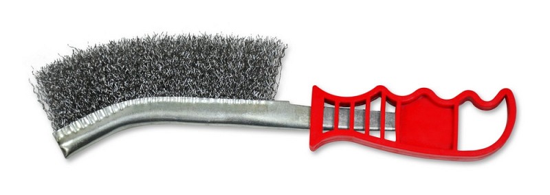 Щітка стальна з пластиковою ручкою, оцинкований або латуньований дріт діаметром 0,3 мм. Дріт виготовлений з міцної та пружної вуглецевої сталі. Один ряд металевого ворсу. Застосовується в промисловості та побуті для ручної зачистки різних металевих поверхонь, зварних швів від шлаку і окалини, обробки металу, деревини, пластику. Щітка легко зарівнює шви металевого виробу від задирок і інших нерівностей металу, що робить виріб безпечним для використання. Якісний метал дроту, оптимальна ширина щітки для обробки поверхні, ергономічна пластика ручка для зручної та швидкої обробки поверхні.