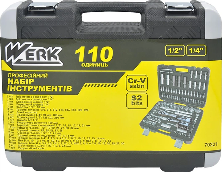 Набір інструментів Werk 70221 - це практичне та універсальне рішення як для домашнього майстра, так і для професіонала. Всі інструменти виконані з міцних та зносостійких матеріалів, що забезпечують тривалий термін служби та надійну роботу. У комплект входять ключові позиції для виконання широкого спектра завдань: біти, торцеві головки, тріскачки, подовжувачі, воротки та інші елементи. Зручний кейс дозволяє компактно зберігати інструменти та брати їх із собою у дорогу чи на об'єкт.