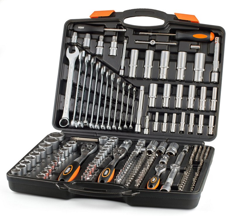 Цей універсальний набір інструментів включає 219 елементів. Головки, тріскачки та ключі виготовлені із високоякісної сталі CrV (хром-ванадієва сталь), що забезпечує міцність, довговічність та стійкість до корозії. Біти виготовлені з якісної сталі S2, що забезпечує тривалий термін служби навіть при інтенсивному використанні. Ідеально підходить для автосервісу, домашнього використання або професійних ремонтних робіт.