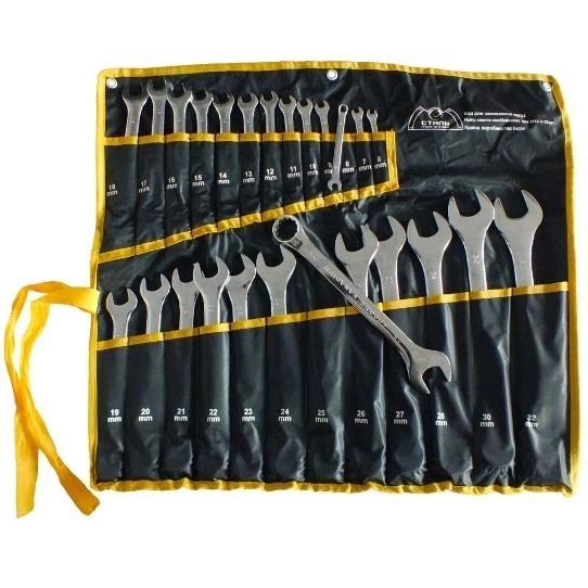 Набір комбінованих ключів виробництва Індія, кожен з яких представляє собою поєднання ріжкового і накидного гайкового ключа. Розмірна лінійка набору - 6; 7; 8; 9; 10; 11; 12; 13; 14; 15; 16; 17; 18; 19; 20; 21; 22; 23; 24; 25; 26; 27; 28; 30; 32 мм. Обидві сторони виробів мають однаковий розмір головки. Виготовлені з міцної хром-ванадієвої сталі, фізичні і хімічні властивості якої зумовлюють високу стійкість до механічних навантажень, корозійну стійкість і твердість. Крім того, легована сталь має сприятливим модулем пружності. Зручна форма і вигин рукоятки забезпечують оптимальні умови для прикладення зусилля, завдяки чому можна закрутити / відкрутити кріпильний елемент. Ключі поставляються в зручному згортається чохлі з кишенькою під ключ кожного розміру.
