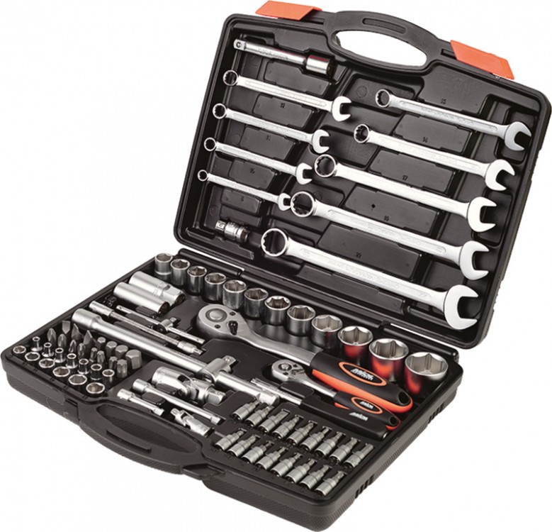 тріскачка з реверсом на (72 зубця); головки: 14-20, 22, 24, 27, 30, 32 мм; карданний шарнір; подовжувачі 125 і 250 мм; потрійний адаптер 3/8"F×1/2"M; головки свічкові 16 і 21 мм; тримач біт; біти (T40, T45, T50, T55), FD (8, 10, 12), PZ (3, 4), PH (3, 4), HEX (8, 10, 12, 14); рожково-накидні ключі 8, 10-14, 17, 19, 22;