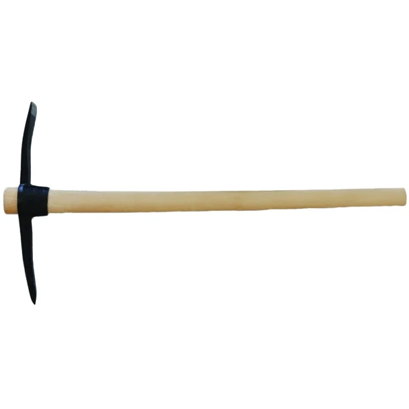 Кирка виготовлена з вуглецевої сталі С45. Ковка та гартування головки забезпечують високу міцність, зносостійкість та має захисне антикорозійне покриття. Тип обробки поверхні бойка - шліфовка. Бойок надійно фіксується на ручці за допомогою зворотнього конусу. Дерев'яна ручка відшліфована та вкрита спеціальною пропиткою для захисту від впливу вологи, сонячних променів та інших зовнішніх факторів. Застосовується для роботи з гірськими породами, камінням та твердими грунтами. Завдяки класичній формі та традиційним матеріалам, зручна та надійна в роботі.