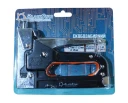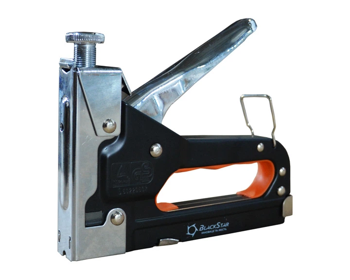 Скобозабивний пістолет виготовлено з міцної інструментальної сталі. Може працювати як з м'якими (пластик, поролон, оббивна тканина), так і з більш твердими типами матеріалів (лінолеум, фанера, тонколистовий прокат, дерево). Зручна рукоятка забезпечує комфортну роботу. Місця контакту пальців та долоні оснащені додатковими гумовими вставками. Оснащень зручним винтом, що регулює силу удару. Металева скоба-запобіжник фіксує рукоятку поза роботою, забезпечуючи компактне зберігання. Степлер механічний може працювати зі скобами шириною 11,3 мм, завдовжки від 4 до 14 мм і перетином 0,7 мм.