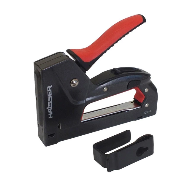 Степлер використовується для закріплення тканини та інших матеріалів, при оббивці меблів. Міцний та надійний корпус та прогумована ручка забезпечують комфортну роботу та довгий термін експлуатації. Перевагою представленої моделі є наявність регулятора сили удару. Для цього степлера використовуються скоби типу Т53 висотою 6-14 мм. Степлер будівельний Haisser 62010 надійний, якісний та функціональний інструмент, стане в нагоді під час виконання оздоблювальних та будівельних робіт.