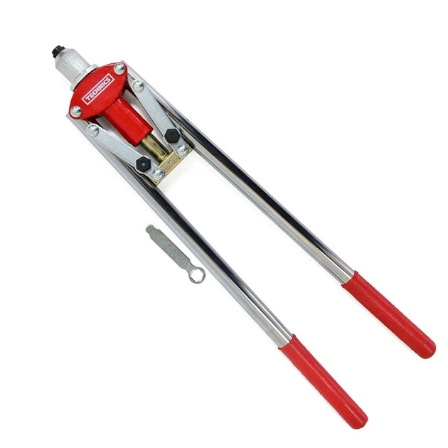 Заклепник металевий, корпус виготовлений із сталі та має антикорозійне хромове захисне покриття. У комплект входять 3 змінні головки під заклепки 3,2 мм, 4 мм, 4,8 мм та ключ для швидкої зміни головок. Зручні гумові ручки. Подовжена головка полегшує роботу у заглибленнях. Заклепник застосовується з алюмінієвими заклепками для скріплення листів металу, пластику, фанери та інших матеріалів. Використовується для невеликих та легких складальних робіт. З його допомогою можна швидко та міцно з'єднати деталі в домашніх умовах без допомоги професіоналів. Завдяки традиційній формі та матеріалам, зручний та надійний інструмент.