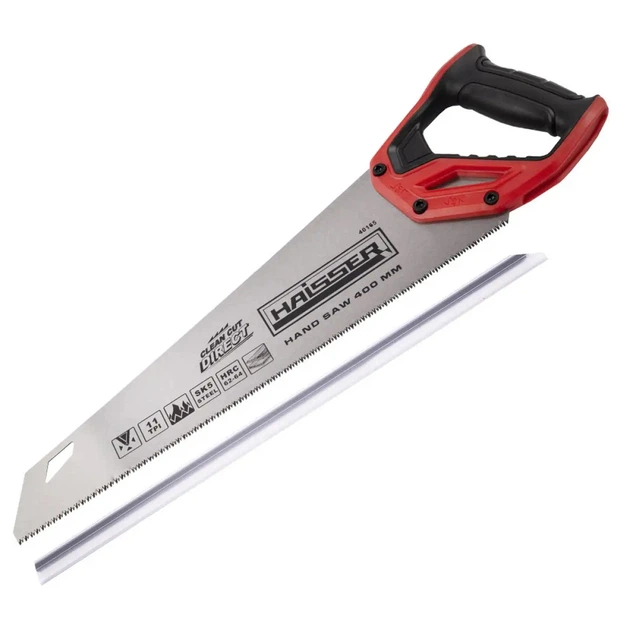 Ножівка по дереву Haisser. Розпечений зуб дозволяє робити пропили як уздовж, так і поперек волокон, забезпечуючи максимальну швидкість пиляння. Загартовування зубів значно підвищує зносостійкість. Матеріал ручки – ABS пластик. Застосування: Для розпилювання заготовок з деревини м'яких та твердих порід. Для обробки різних штучних матеріалів (ДСП, ламінат, ПХВ).