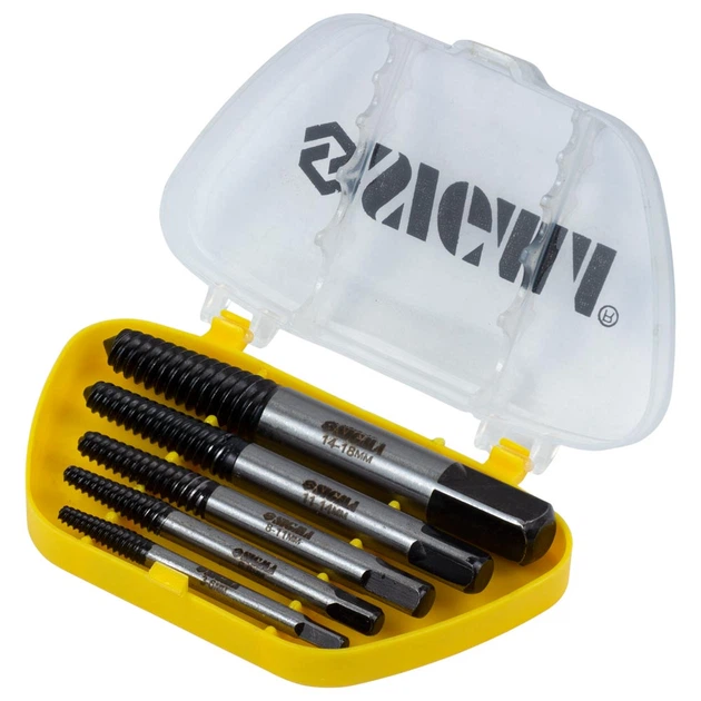 Набір екстракторів 5шт. Ø3.0-18.0мм SIGMA (1200051) Призначений для викручування зламаних кріпильних елементів - зірваних, зламаних болтів та шпильок різних діаметрів. Екстрактор складається з прямокутної головки, круглого валу та конічного закінчення із зворотним різьбленням. Має жорсткий спіралеподібний профіль із квадратним кріпленням. Щоб витягнути деталь, що застрягла, її слід спочатку зачепити, а потім викрутити. Для цього в центрі кріплення потрібно просвердлити поглиблення, потім заклинити в ньому екстрактор і з його допомогою викрутити заломлену частину, що застрягла. свердлом роблять отвір Екстрактор відповідного розміру вбивають або вкручують в отвір Після надійного заклинювання екстрактор викручують разом із старою деталлю