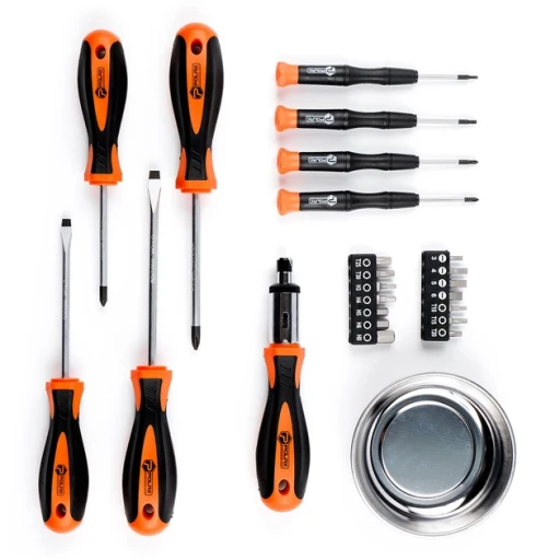 - 4 стандартні викрутки, 4 викрутки для точних робіт, 1 битотримач з реверсом, 14 біт, намагнічена ємність для біт та металовиробів