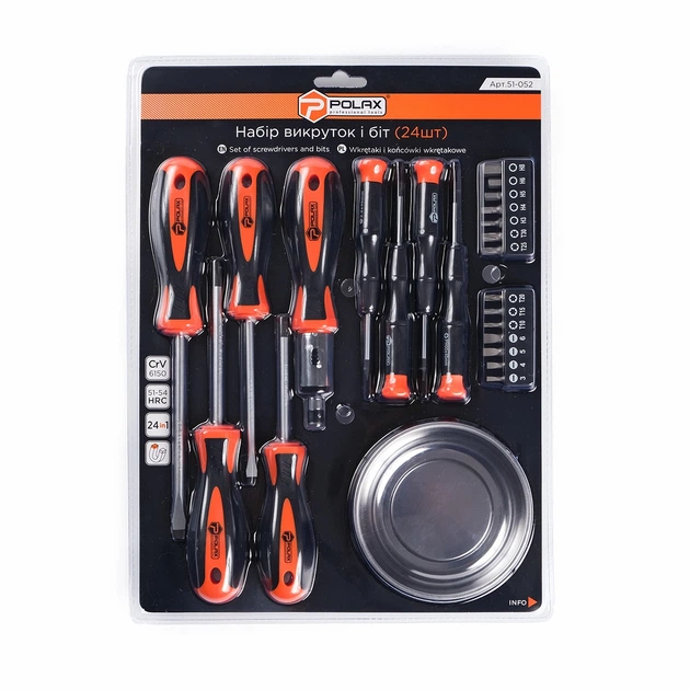 Набір викруток і біт Polax 24 предмета (51-052) - це ідеальне рішення для тих, хто шукає універсальний і високоякісний інструмент для широкого спектра завдань. Цей набір забезпечує все необхідне для успішного виконання ремонтних, будівельних і монтажних робіт. Комплект містить 4 викрутки стандартних розмірів: SL5 x 100, SL6 x 125, PH1 x 75 мм, PH2 x 100 мм, а також 4 викрутки для точних робіт: SL2,5 x 40 мм, SL2 x 40 мм, PH00 x 40 мм, PH0 x 40 мм. Це дає змогу ефективно справлятися з різними видами гвинтів і кріпильних елементів. У наборі також присутній універсальний бітотримач з реверсом і 14 біт різних розмірів: SL3, SL4, SL5, SL6, T10, T15, T20, T25, T30, H3, H4, H5, H6, H8. Такий набір біт забезпечує гнучкість і універсальність під час роботи з різноманітними матеріалами та видами гвинтів. Робоча частина викрутки і біти виготовлені з міцної Cr-V сталі відповідно до стандарту DIN 6150, забезпечуючи високу міцність і довгий термін служби. Твердість HRC 51-54 гарантує довговічність і надійність при використанні. Універсальний бітотримач з реверсом і двокомпонентні ручки викруток забезпечують комфорт під час роботи, а наявність намагніченого наконечника робить монтаж і демонтаж кріплення швидким і точним. У комплекті також передбачена намагнічена ємність для зберігання біт і метизів, створюючи порядок у вашому робочому просторі.Цей набір - це виняткове поєднання стилю, функціональності та надійності. Даруйте собі можливість працювати із задоволенням, обираючи набір викруток і біт Polax24 предмети (51-052). Ваш майстерний підхід заслуговує на такий інструмент!