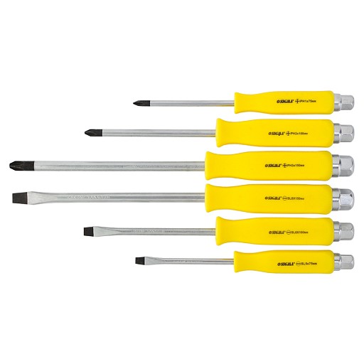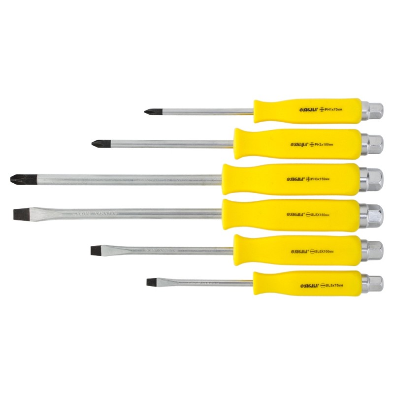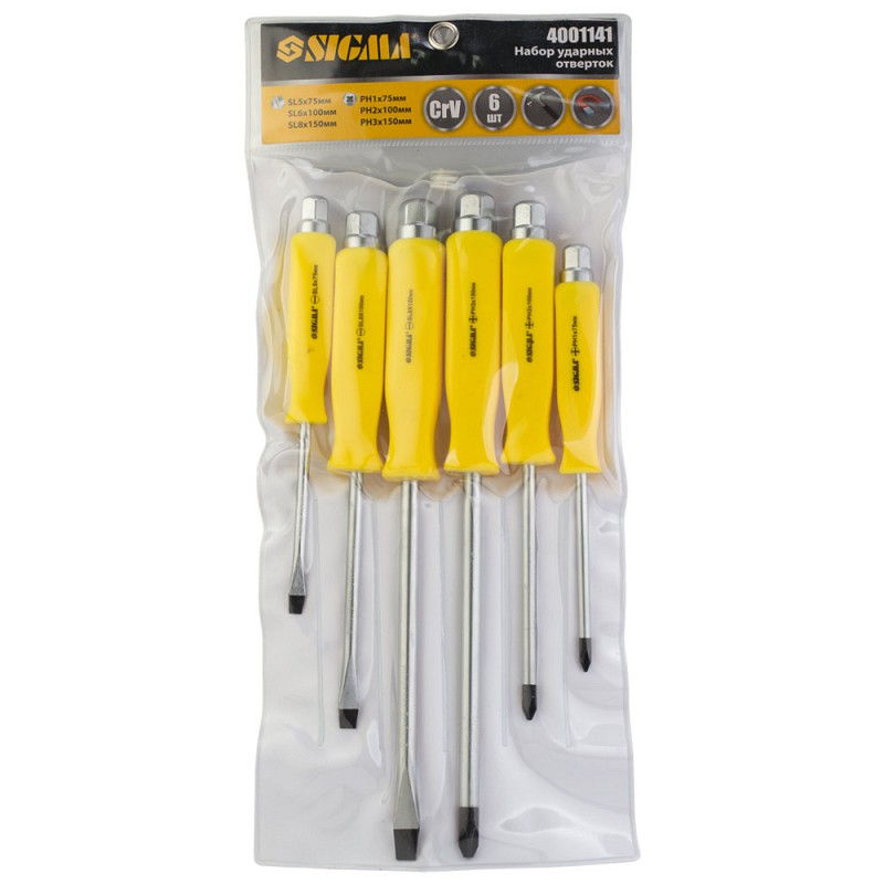 Набір викруток ударних під ключ 6шт CrV SIGMA (4001141) призначений для відкручування заржавілих і прикипіла гвинтів і саморізів. Всі викрутки мають ударостійку рукоятку з посиленим для затягування ключем підставою, стрижень виготовлений з високоякісної хромованадіевой стали оснащений оксидованим магнітним наконечником. Особливості: Crv сталь; Магнітний наконечник; Під ключ. 6 предметів: SL5×75мм, SL6×100мм, SL8×150мм; PH1×75мм, PH2×100мм, PH3×150мм. Основні дані Торгова марка Sigma Технічні дані Матеріал CrV Особливості Магнітний накінечник, під ключ Габаритні розміри Розмір РН1×75 мм. РН2×100 мм. РН3×150 мм; SL5×75 мм. SL6×100 мм. SL8×150 мм Упаковка товара Тип упаковки PVC пакет з заклепками Залишити відгук