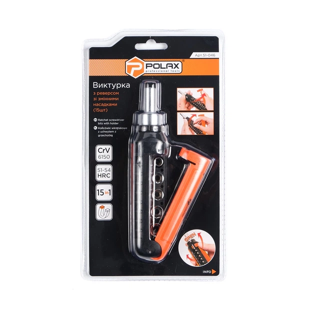 Викрутка Polax з реверсом, змінними насадками і бітами 15 в 1 (51-046) - це елегантний і практичний інструмент, який поєднує в собі стильний дизайн зі зручністю використання. Ідеальний вибір в якості подарунка або доповнення до вашого інструментарію. У цієї викрутки зручна, стильна і практична конструкція, що робить її не тільки функціональним інструментом, але й естетичним аксесуаром. Ручка з реверсом надає зручне зберігання біт і насадок, що забезпечує легкий доступ до необхідних інструментів у процесі роботи. До комплекту постачання входить 1 ручка, 8 біт (SL3, SL5, SL6, PH0, PH1, PH2, PH1, PH2, T15, T20), адаптер для торцевих насадок і 5 торцевих насадок (6, 7, 8, 9, 10 мм). Цей набір забезпечує широкий спектр можливостей для роботи з різними видами гвинтів і кріпильних елементів. Робоча частина викрутки виготовлена з міцної Cr-V сталі, що відповідає стандарту DIN 6150, з твердістю HRC 51-54. Це гарантує високу міцність інструменту і його довгий термін служби. Ручка виконана з міцного пластику, забезпечуючи комфорт і надійність у використанні.Викрутка Polax 15 в 1 - це не тільки багатофункціональний інструмент, а й стильний аксесуар, що зробить ваші роботи ще більш приємними. Будьте готові до різних завдань з цим універсальним набором.