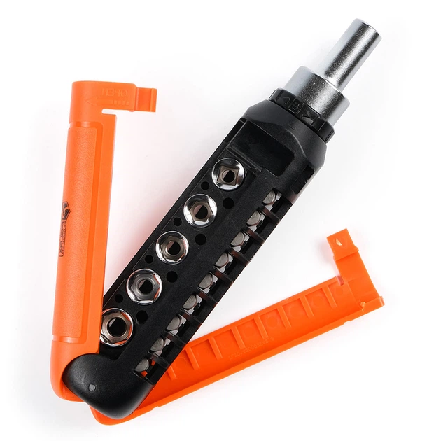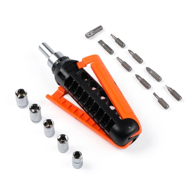 - Ручка з реверсом і зберіганням, біти 8 шт (SL3, SL5, SL6, PH0, PH1, PH2, T15, T20), торцеві насадки 5 шт (6 мм, 7 мм, 8 мм, 9 мм, 10 мм), Адаптер для торцевих насадок