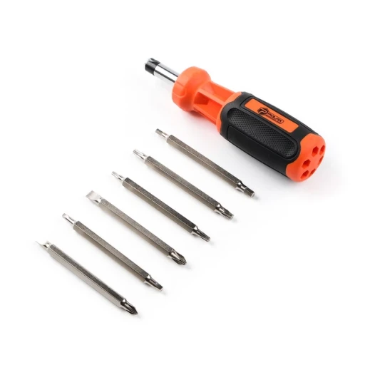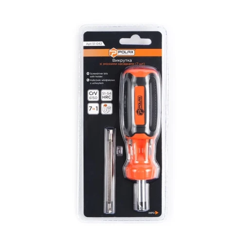 Викрутка Polax з реверсом і змінними бітами 7 в 1 (51-042) - це багатофункціональний інструмент, призначений для різних видів ремонтних і будівельних робіт. Ця викрутка поєднує в собі зручність, надійність і високу продуктивність, роблячи її ідеальним вибором для професіоналів і любителів. У наборі представлено 1 ручку-тримач з реверсом і 6 двосторонніх насадок для різних видів гвинтів і кріпильних елементів: (SL5-PH1, SL6-PH2, T10-T15, T20-T25, H3-H4, S1-S2). Це забезпечує широкий спектр застосування інструменту в різних ситуаціях. Робоча частина насадок виготовлена з міцної Cr-V сталі з відповідністю стандарту DIN 6150 і твердістю HRC 51-54. Це гарантує довгий термін служби і високу ефективність при використанні в різних умовах. Двокомпонентна ручка забезпечує зручне і надійне зчеплення, знижуючи втому під час роботи. Довжина ручки становить 105 мм, а довжина біти - 85 мм, що робить цей інструмент зручним для роботи в різних ситуаціях. Загальна довжина викрутки дорівнює 150 мм, забезпечуючи достатнє покриття і маневреність.Викрутка Polax 7 в 1 з реверсом і змінними насадками - це надійний і універсальний інструмент, готовий до ефективного виконання різних завдань. Підвищіть свою продуктивність з цим компактним і функціональним набором.