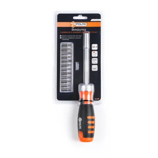 - Комплектація: Викрутка Polax з реверсним механізмом, 12 змінних бітів