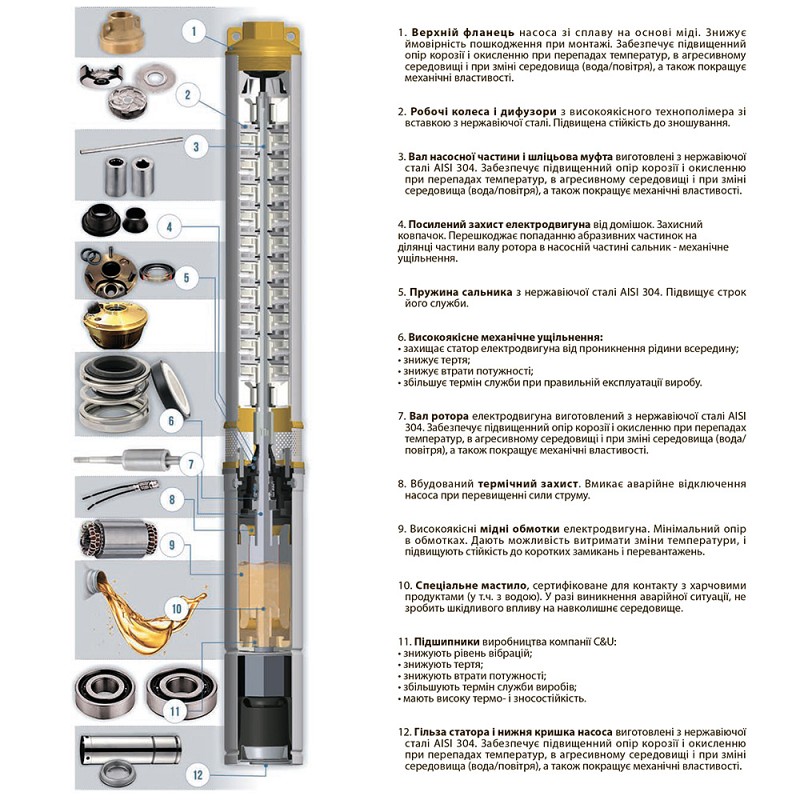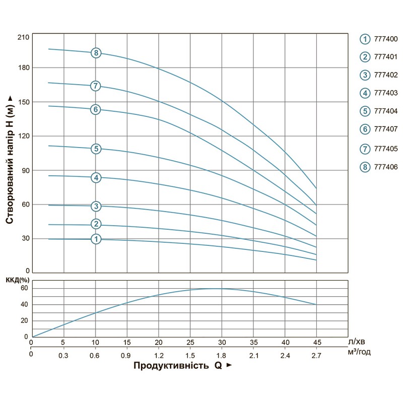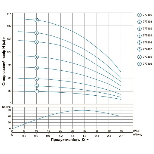 Насос відцентровий свердловинний 0.55кВт H 86 (66) м Q 45 (30) л / хв Ø80мм 40м кабелю AQUATICA (DONGYIN) 3SEm1.8/20 (777403) Насоси даної серії призначені для перекачування чистої води і можуть застосовуватися: для побутового використання при водопостачанні з свердловин і резервуарів (обов'язкова установка кожуха охолодження), для перекачування води в резервуари, для зрошувальних систем, для автоматичної подачі води спільно з невеликими резервуарами при використанні керуючої автоматики (керуючі реле, контролери тиску). Насосна частина: Корпус насосної частини: нержавіюча сталь AISI 304 Вихідний фланець: латунь Вал насосної частини: нержавіюча сталь AISI 304 Муфта вала: нержавіюча сталь AISI 304 Робоче колесо: технополімер Шайба фасонная розділова: технополимер Дифузор: технополимер Електродвигун: Тип двигуна: асинхронний, маслонаповнений, з вбудованою в обмотку термозахистом Обмотка статора: мідь Корпус електродвигуна: нержавіюча сталь AISI 304 Вал двигуна: нержавіюча сталь Механічне ущільнення: кераміка/графіт Підшипник: кочення (C&U) Напруга: U 1 ~ 230 ± 10% В Частота: 50 Гц Клас ізоляції: F Клас захисту: IP68 Кабель: 3 × 1.0 мм² × 40 м (кількість жил × перетин × довжина) Умови застосування: Максимальна температура рідини: + 35ºС Глибина занурення під дзеркало води: до 60 м Діаметр свердловини: від 93 до 110 мм Зміст абразівосодержащіх домішок в підвішеному стані (піску, глини, вапна і т.д.): не більше 0.25% Водневий показник води (рН): 6.5-8.5 Загальна мінералізація води: не більше 1500 г/м³ Термін гарантійного обслуговування: 24 місяці Основні дані Торгова марка Dongyin Гарантія, міс 24 Технічні дані Тип відцентрові Потужність, Вт 550 Максимальний напір, м 86 Максимальна продуктивність, л/хв 45 Діаметр свердловини, мм від 93 до 110 Кількість фаз Однофазний Напруга U 1 ~ 230 ± 10% В Номінальна сила струму, I (А) 4.2 Частота, Гц 50 Потужність двигуна приводу, к.с. 0.75 Вал двигуна Нержавіюча сталь Робоче колесо Технополимер Тип двигуна Асинхронний, маслонаповнений, з вбудованим в обмотку термозахистом Обмотка статора двигуна Мідь Механічне ущільнення Кераміка/графіт Клас ізоляції F Клас захисту IP68 Довжина кабелю, м 40 Перекачувана рідина Зміст абразівосодержащіх домішок (піску, глини, вапна і т.д.): не більше 0.25% Діаметр напірного патрубка DN2, "(дюйм) 1 Матеріал корпусу Нержавіюча сталь AISI 304 Діаметр, мм 80 Максимальна глибина занурення під дзеркало води, м до 60 Максимальна температура перекачуваної рідини, °C 35 Максимальний діаметр свердловини, мм 110 Діаметр твердих частинок в підвішеному стані, мм 0.2 Габаритні розміри Маса нетто, кг 13.0 Маса брутто, кг 13.95 Упаковка товара Довжина упаковки, мм 1100 Ширина упаковки, мм 110 Висота упаковки, мм 205