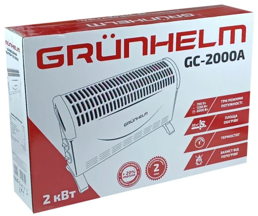 Конвектор Grunhelm GC-2000A 2 кВт – недорогий, але водночас досить потужний пристрій для обігріву. Конвектор побутового класу виконаний з металу, при цьому корпус має порошкове забарвлення і захищений від впливу корозії.