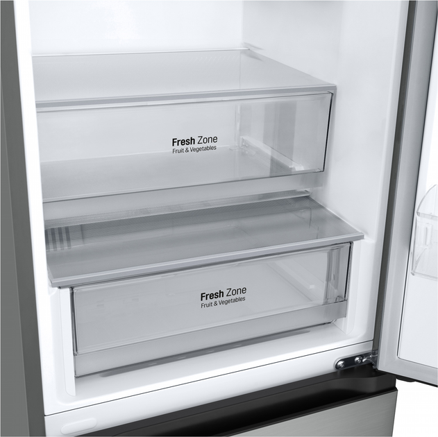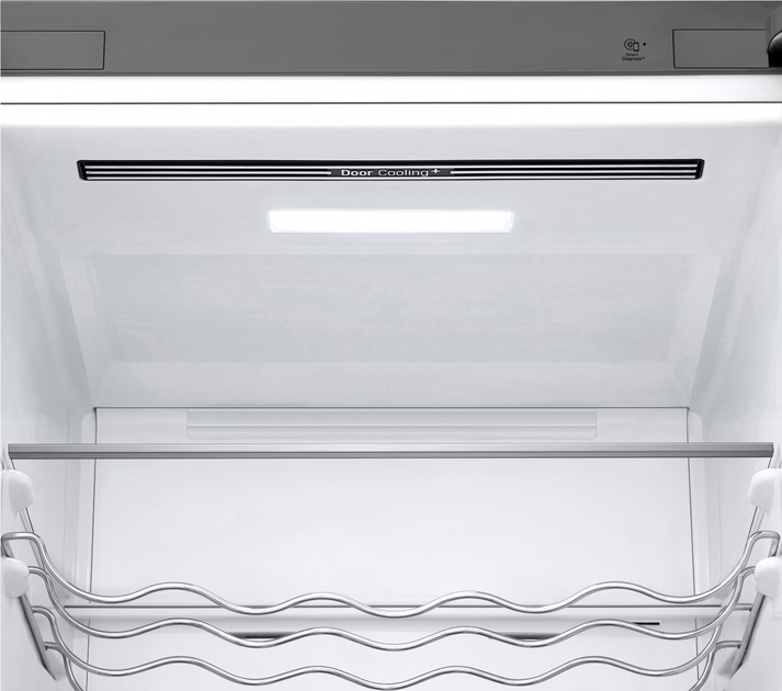 *На підставі результатів UL тесту, відповідно до внутрішнього методу LG, який порівнює час, необхідний для зниження температури верхнього дверного кошика з 24.8°C до 8°C між моделлю LG без DoorCooling+ (GBB60NSZHE) та моделлю з технологією DoorCooling+ (GBB72NSDFN). DoorCooling+™ не працює, коли двері відкриваються.