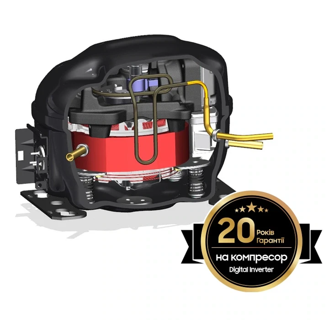 * На основі внутрішнього тестування порівняно зі звичайними компресорами Samsung 53. ** 20-річна гарантія поширюється на компресор (діє у всьому світі, крім Північної Америки).