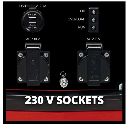 - Особливості: Інверторна технологія – для потужності без стрибків напруги; 2 розетки 230 В/50 Гц; 2 порти USB 5В - 2,1 А; критий корпус для безшумної роботи; Міцні ніжки для безпечної роботи; Вимкнення при перевантаженні та низькому рівні масла; Простий у використанні приводний трос для запуску; Ручка для перенесення та зручного транспортування).