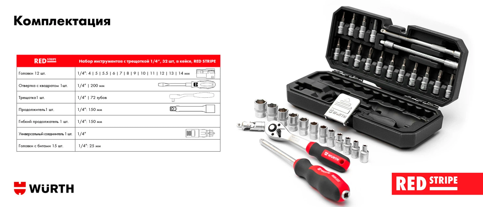 Інноваційні набори від німецького виробника WÜRTH відповідають усім необхідним вимогам. Лінійка RED STRIPE націлена як для професійних задач, так і побутових. Завдяки якісним матеріалам, високотехнологічним методам виробництва набори інструментів WÜRTH RED STRIPE отримали визнаність у всьому світі.