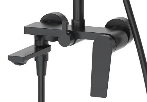 - Комплектація - змішувач з виливом, душова стійка з вернім та ручним душем, шланг, комплект підключення